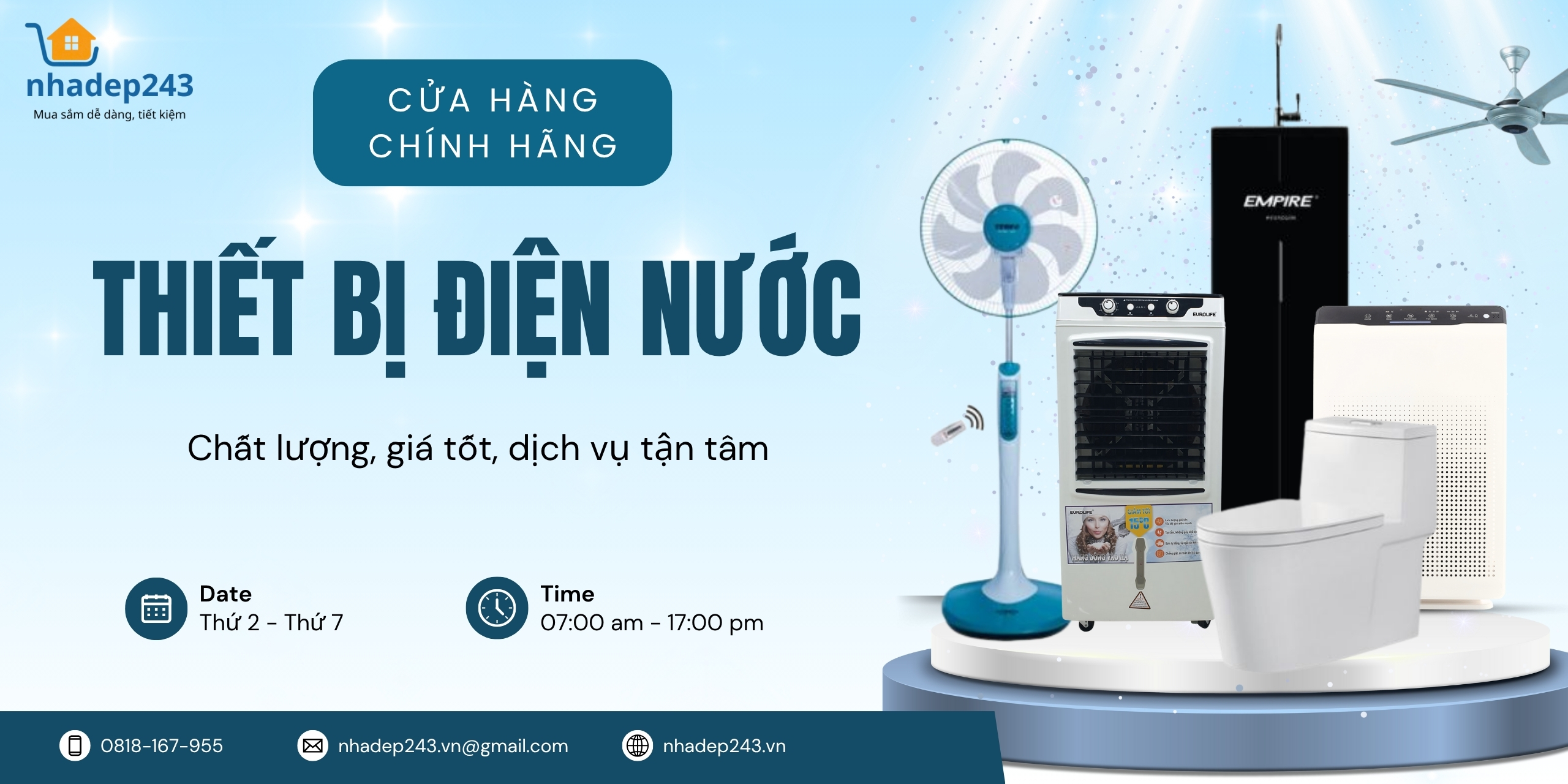 Nhà đẹp 243 là đơn vị hàng đầu tại Đà Nẵng chuyên cung cấp thiết bị điện nước, gia dụng, điện máy, đèn trang trí và thiết bị vệ sinh. Với hơn 10 năm kinh nghiệm, chúng tôi cam kết mang đến sản phẩm chính hãng, chất lượng cao cùng dịch vụ tận tâm, đáp ứng nhu cầu đa dạng của khách hàng cá nhân và doanh nghiệp.